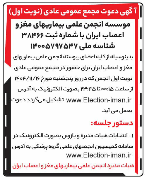 بدینوسیله از کلیه اعضای پیوسته انجمن علمی بیماریهای مغز و اعصاب ایران برای حضور در مجمع عمومی عادی نوبت اول انجمن که در روز پنجشنبه مورخ 16/11/1404 از ساعت 00:15 تا 23:45 بصورت الکترونیک به آدرس www.Election-iman.ir تشکیل میگردد دعوت بعمل می آید.